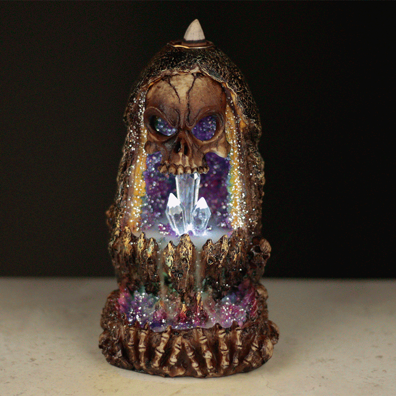 Stojánek na vonný kužel pro kouřový vodopád - Lebka a křišťál s LED