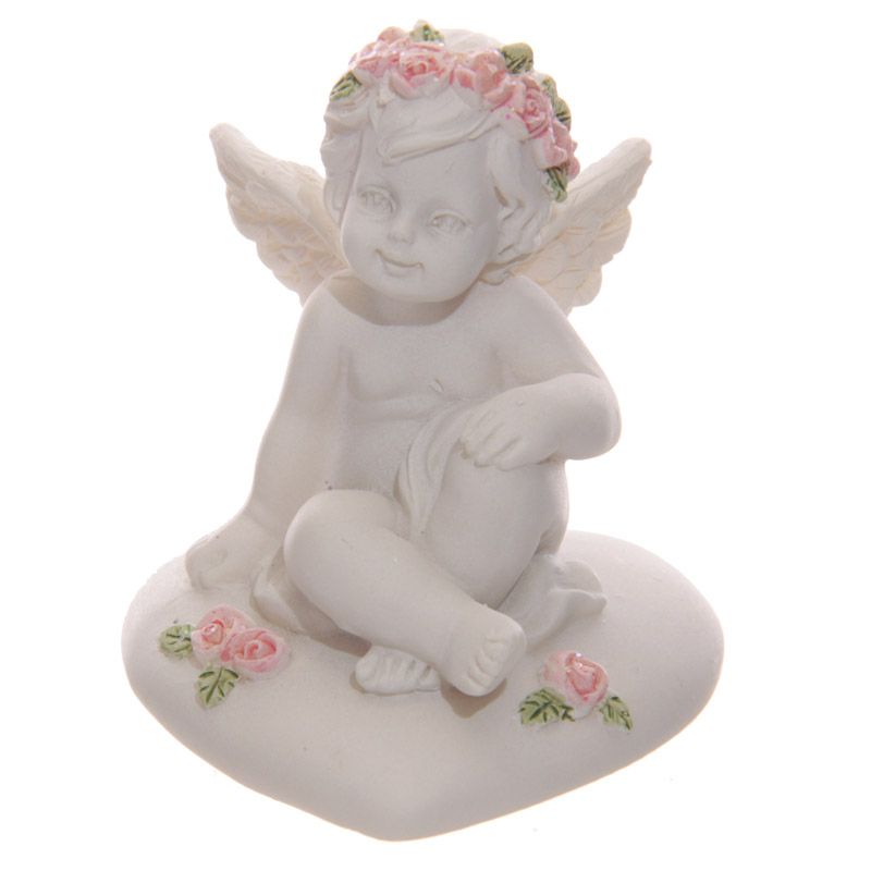 Cherub sedící na srdci, zdobený růžičkami
