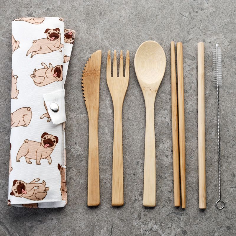 Sada 6 jídelních potřeb z bambusu v plátěném obalu Mopsík