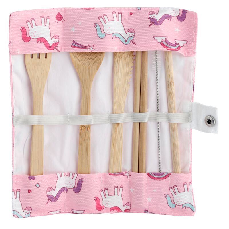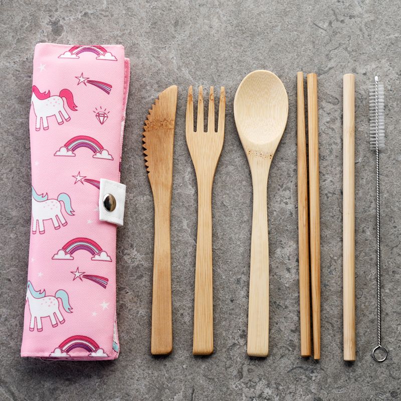 Sada 6 jídelních potřeb z bambusu v plátěném obalu Kouzelný duhový jednorožec