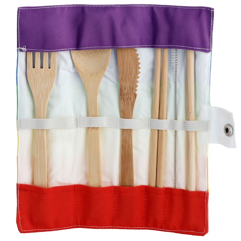 Sada 6 jídelních potřeb z bambusu v plátěném obalu Duhové pruhy