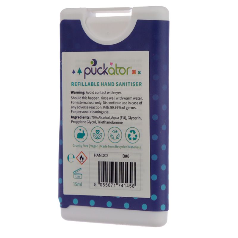 - Doplnitelné: Ano - Zvedněte sponu chránící postřikovač a vytáhněte sponu. Dezinfekční prostředek na ruce lze poté znovu naplnit otvorem a sponku zasunout zpět..