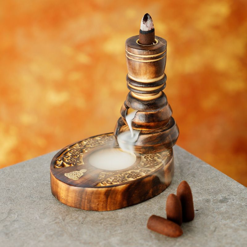 - Informace o produktu: Kadidlo se zpětným tokem vytváří mlhu, která proudí skrz aromalampu a kolem produktu. Tento produkt musí být umístěn na žáruvzdorném povrchu. Při zpětném hoření kadidla může mlha, kterou vytváří, zanechat lehké zbytky na hořáku a povrchu, na který je hořák umístěn. Vycházejí z přírodních olejů a pryskyřic uvnitř kadidla a lze je otřít vlhkým hadříkem. Nikdy nenechávejte hořící kadidlo bez dozoru.
