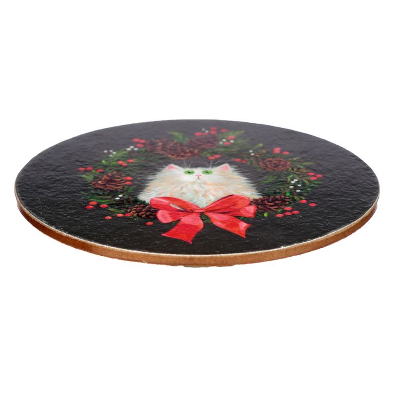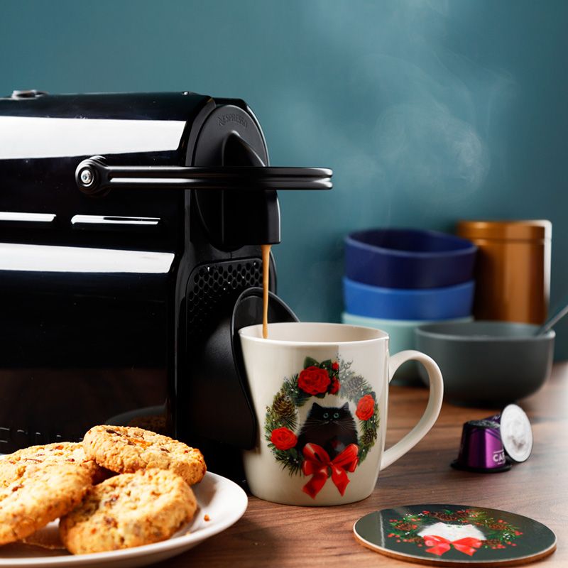 Set porcelánový hrnek & podtácek Kočka a vánoční věnec, design Kim Haskins